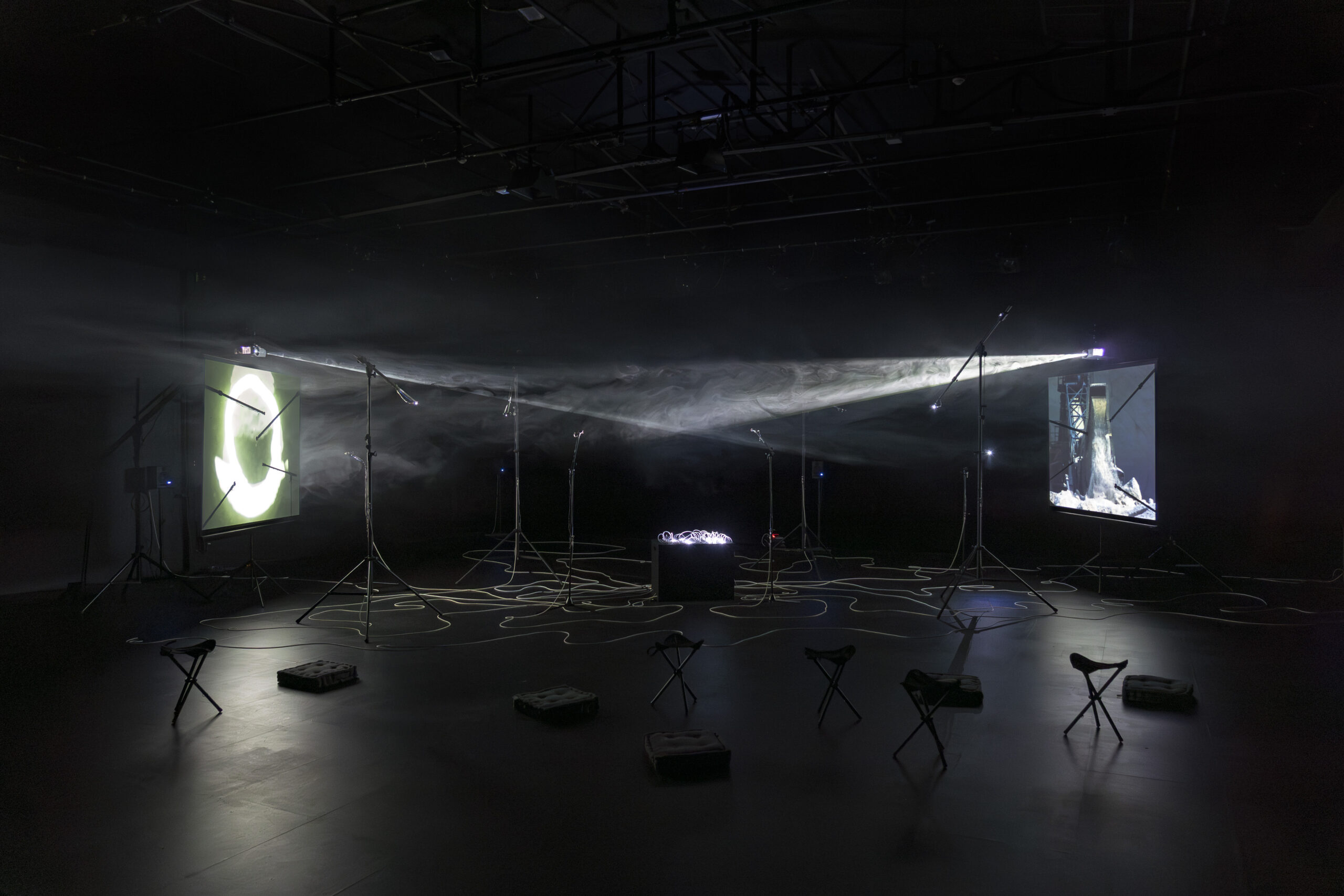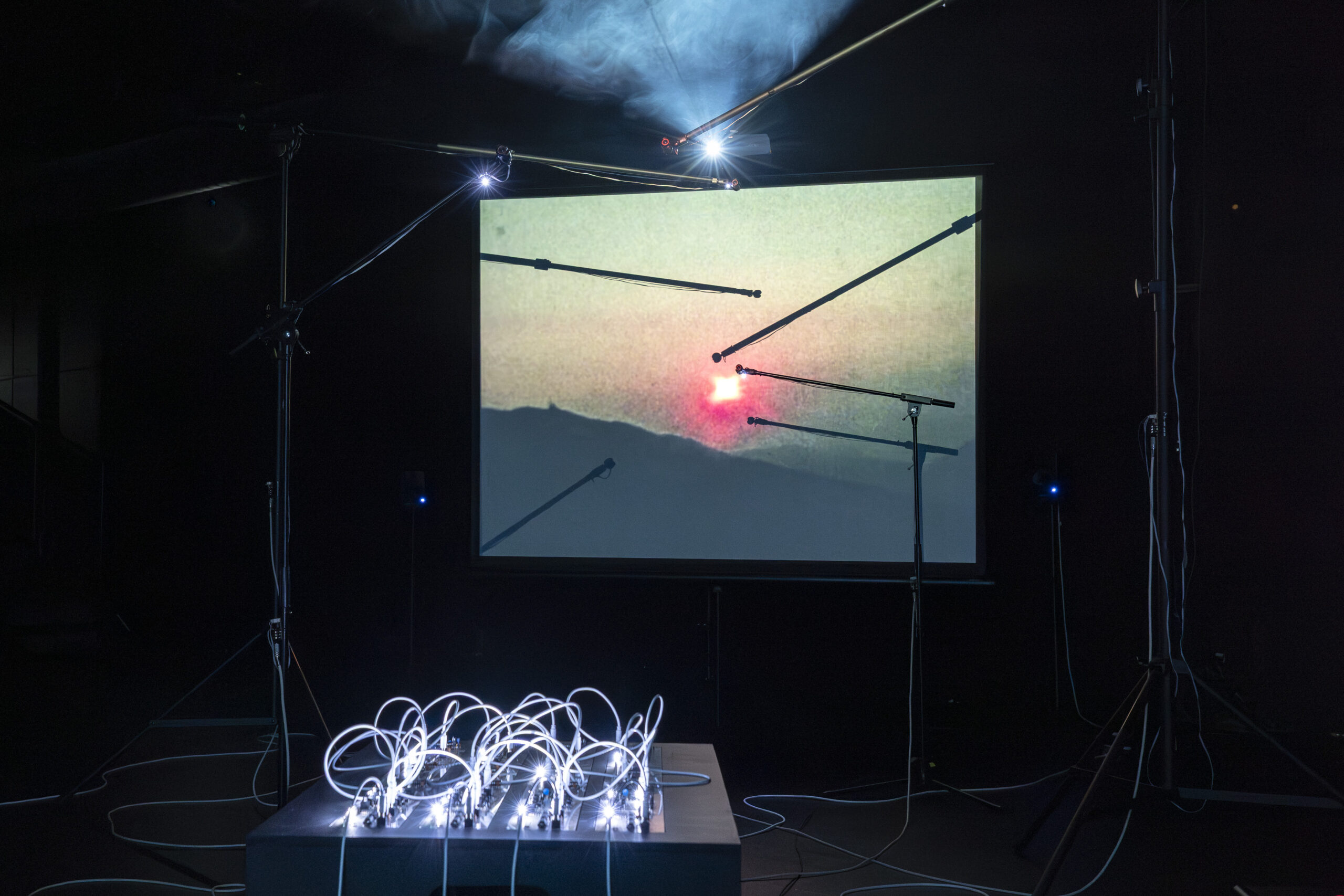 Interrogeant l’intersection du temps qui passe, le souvenir et l’oubli qui l’accompagne, ce dispositif, activé à partir de vidéos d’archives, met en jeu une machinerie sensible où se rencontrent voix et événements sonores. Lieu de toutes les connexions, l’installation devient ici cerveau, point de rencontre entre le réel et l’imaginaire, entre le rêve et le souvenir. A la manière d’un oracle moderne, l’ensemble tisse et compose des connexions entre fragments du passé et divagations poétiques autour de nos mémoires humaines et non-humaines, créant ainsi un continuum où le temps n’est ni linéaire ni fixe, mais plutôt une constellation d’instants entrelacés.