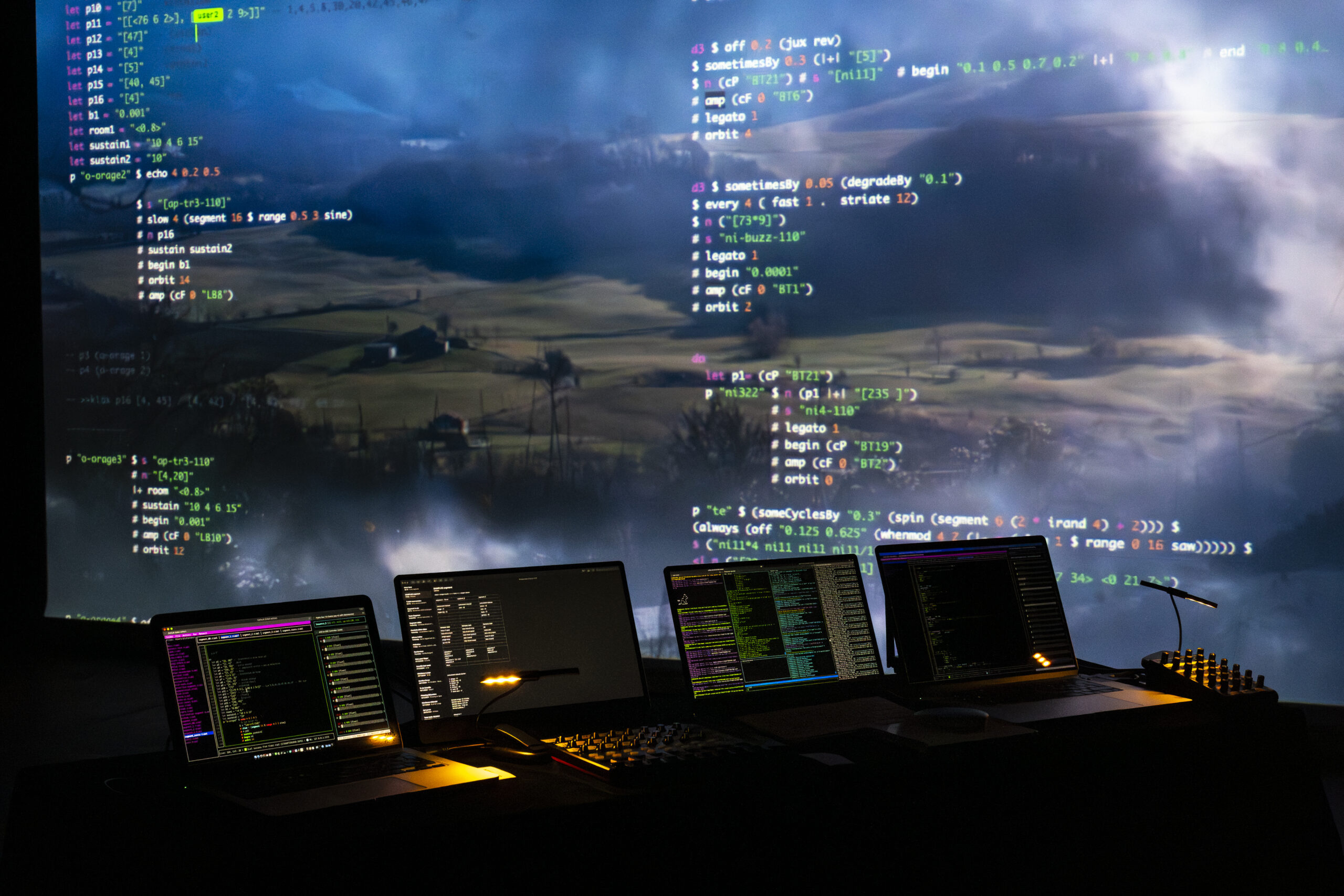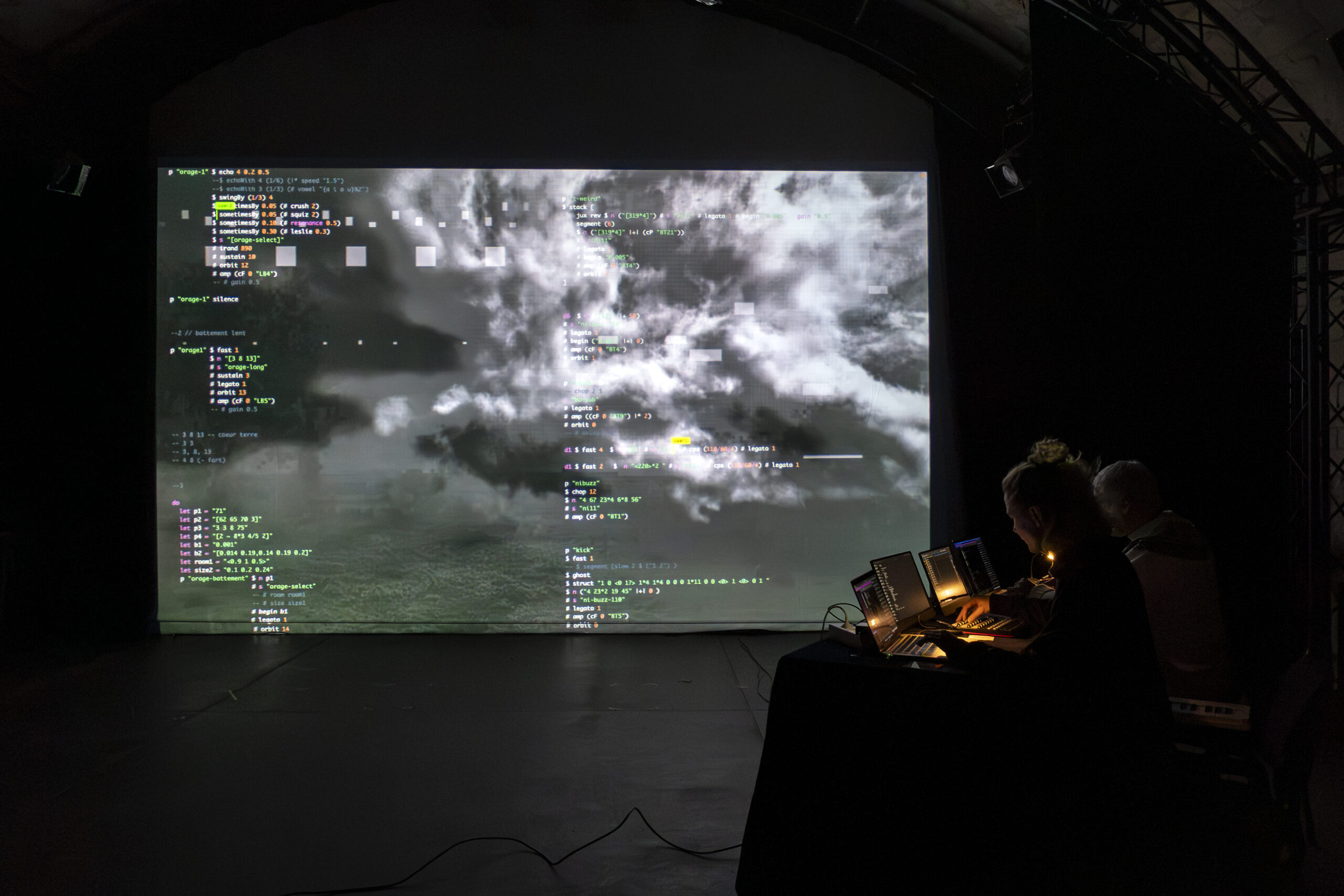 Performance de live coding et de visualisation en temps réel, où des formules algorithmiques génèrent un paysage sonore immersif mêlant textures numériques et matières organiques.