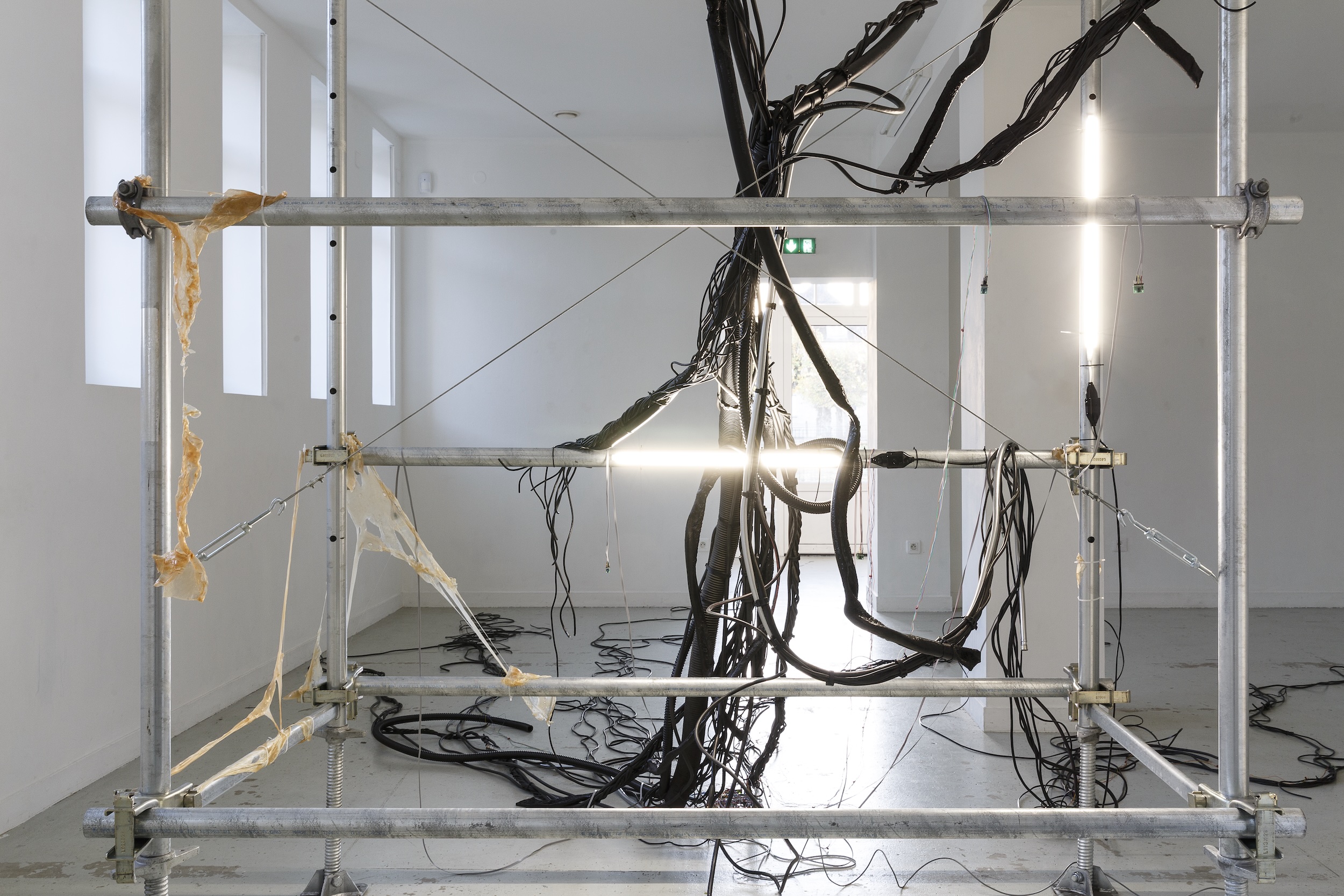 Au croisement de la sculpture, du son et de la performance, l’installation fonctionne comme un organisme malade [...]