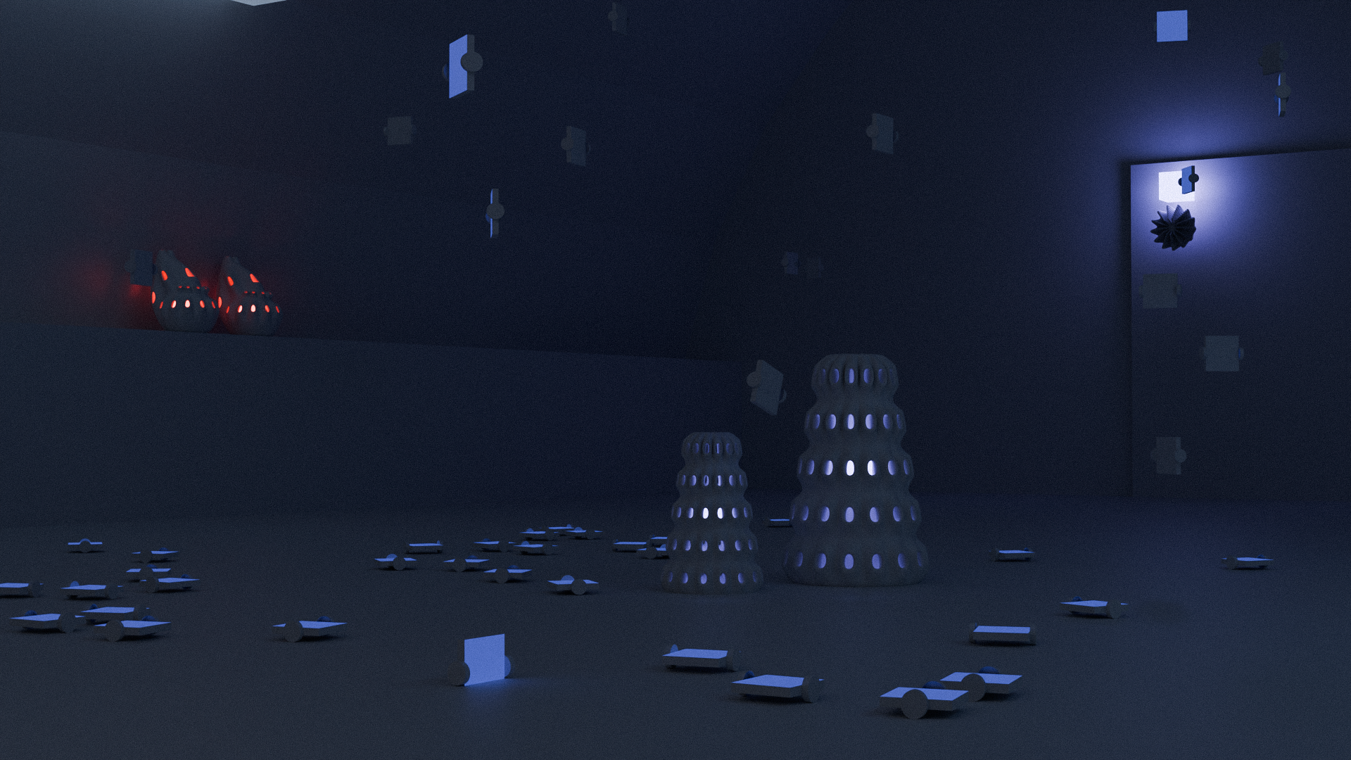 L'installation crée un espace hybride évoquant une caverne artificielle, construite à partir de prismes, de végétaux imprimés [...]